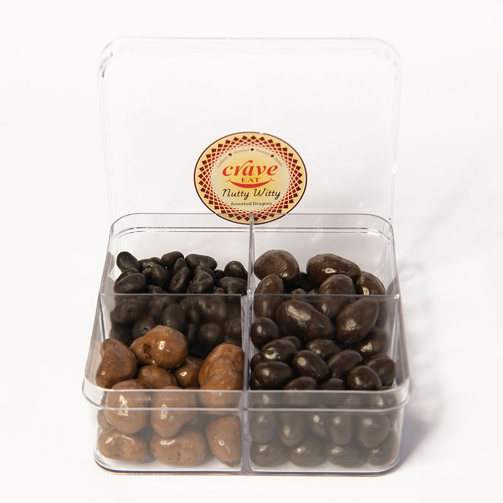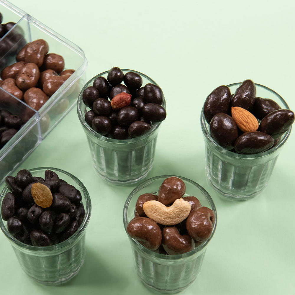 A luxurious assortment of four classic favourites – crunchy cashews, roasted almonds, crisp peanuts, and chewy raisins – each coated in a rich layer a combination of Milk, Dark and Blended smooth chocolate. Packed in a sleek see-through box, this elegant selection is perfect for gifting or personal indulgence. A delightful mix of taste and texture in every bite.