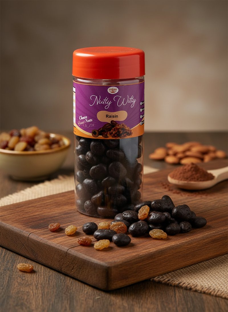 Juicy, sun-dried raisins wrapped in a smooth, luscious layer of chocolate. This bite-sized treat offers a delightful balance of fruity sweetness and rich cocoa – perfect for guilt-free snacking, gifting, or a sweet pick-me-up any time of day.